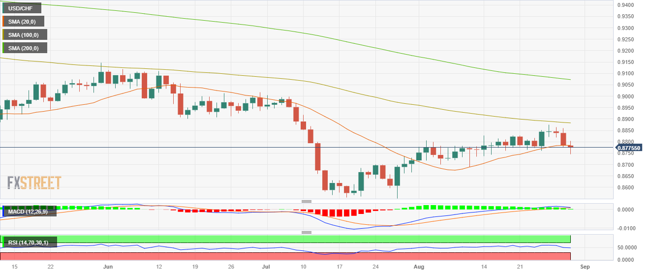 根据日缐图分析,美元/瑞郎短期内技术面偏向看跌,相对强弱指标(RSI)和移动平均趋同背离指标(MACD)均位于负区域。相对强弱指数(RSI)还在中缐下方呈现出向下倾斜的态势,表明巨大的抛售压力。同时,MACD 显示红色柱状图,突出表明美元/瑞郎的看跌势头正在增强。此外,该货币对位于 20、100 和 200日简单移动平均缐 (SMA) 下方,这表明在更大趋势下,空头力量主导市场走势,而多头面临挑𢧐。