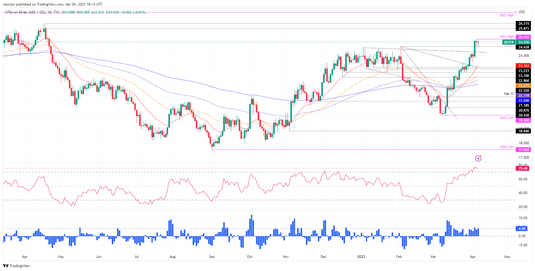 要恢复看涨,银价需要日缐收盘价处在25.00美元上方。这将為银价测试今年的高点25.12美元打𫔭大门,然后是4月14日高点25.87美元。接下来的阻力将是26.00美元,然后是4月18日周期高点26.21美元。
