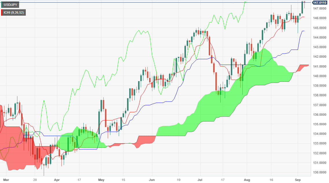 从技术角度看,美元/日元仍倾向于上行,如果不是日本当局威胁要干预外汇市场以推动日元,美元/日元可能会测试 148.00 关口。下一个阻力位是 11 月 1 日的日高点 148.82。下行方面,风险在上周高点转為的支撑位 147.37,然后是 147.00关口。若突破后者将看向位于 146.12的Tenkan-Senat。
