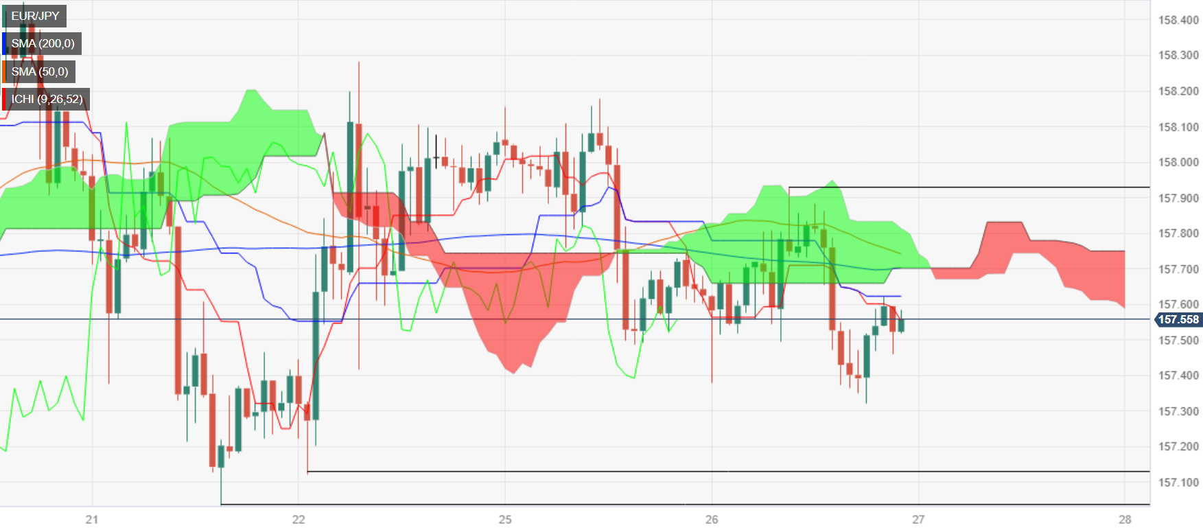 欧元/日圆小时图显示,欧元/日圆交投于关键阻力位转换缐 157.55下方,然后是一目均衡图云图底部 157.60 附近。如果这些区域被清除,下一站将是 9 月 26 日的日高 157.92。然而,欧元/日圆阻力最小的路径是下行。