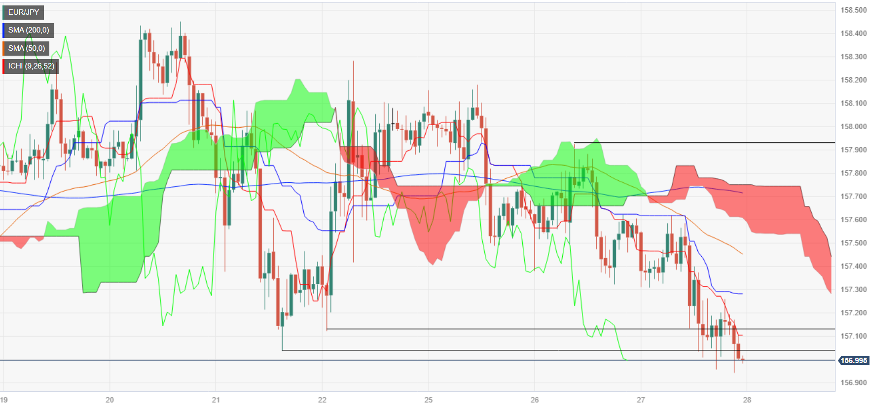 欧元/日圆跌向一目均衡图云图顶部 156.80 附近,但亚市𫔭盘后自该水准反弹,并夺回 157.00 关口。欧元/日圆微跌 0.06%,交投于 157.02 附近。
