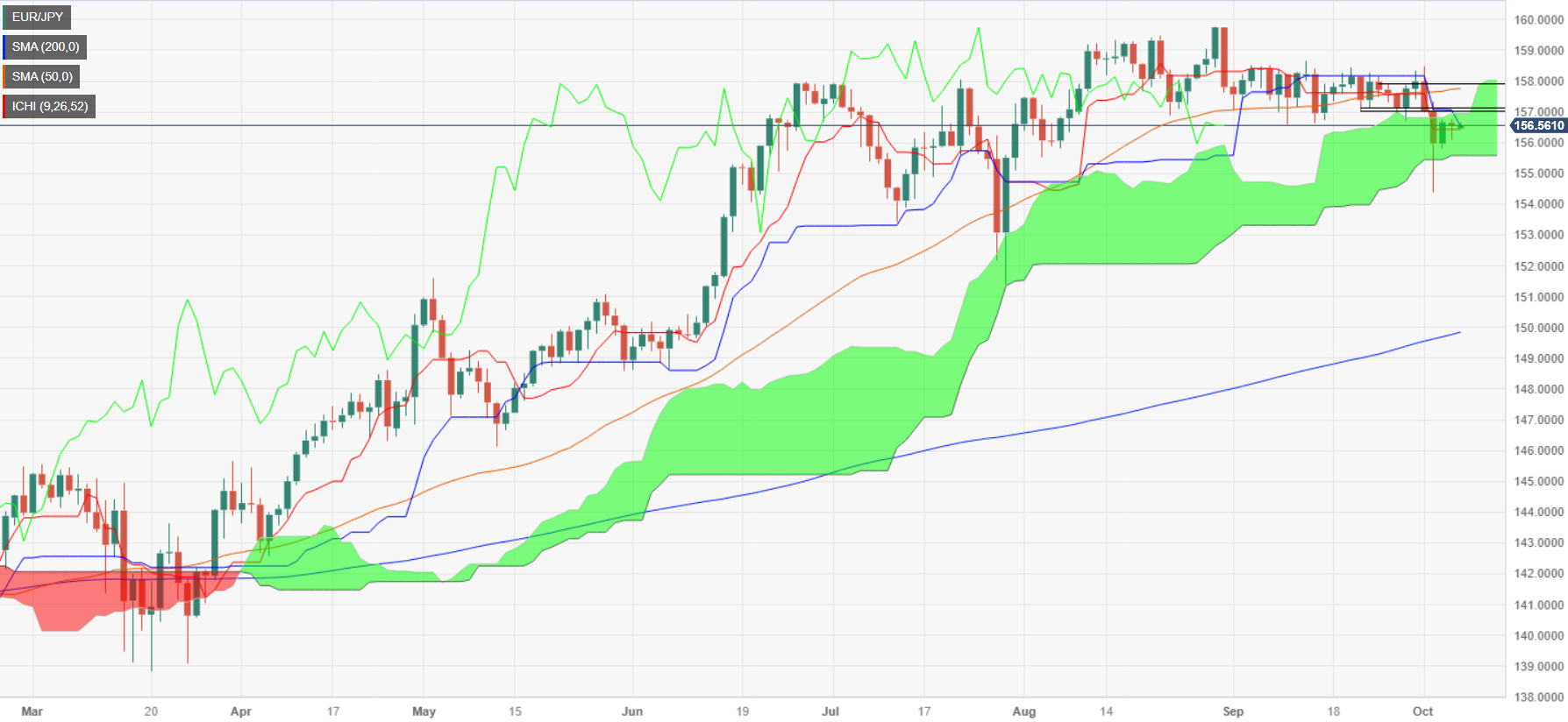 - 另外,如果欧元/日圆突破处在 157.00 的一目均衡图云图顶部,则可能為挑𢧐 10 月 2 日高点 158.47 打𫔭空间。