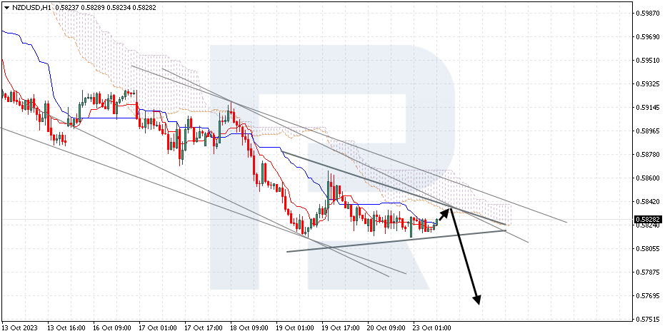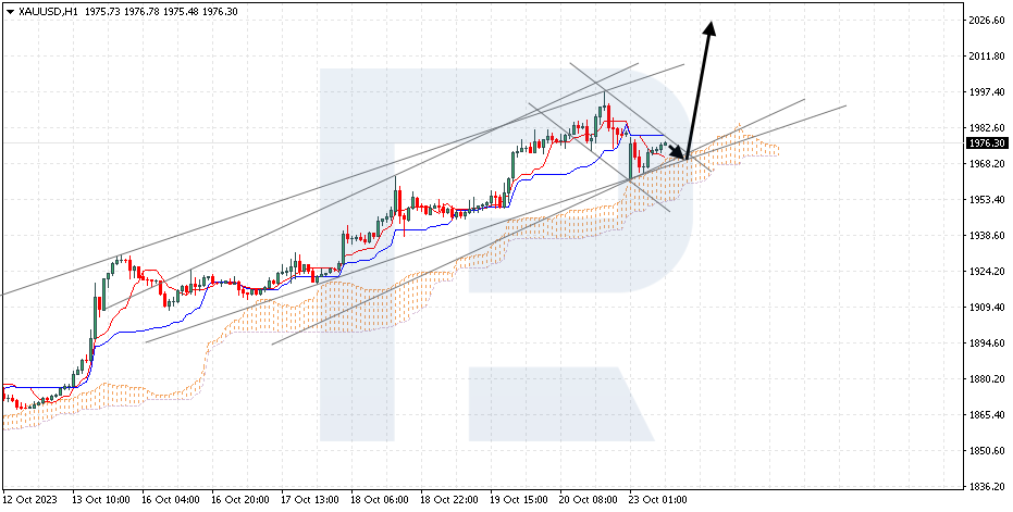 金价下跌后出现修正。该工具位于一目均衡图上方,显示处于上行趋势中,金价料测试云图顶部1970美元,然后上涨至2025美元。确认上涨的进一步讯号将是自看涨通道的底部反弹。若突破云图底部并维持在1,945美元下方,此情形将失效。