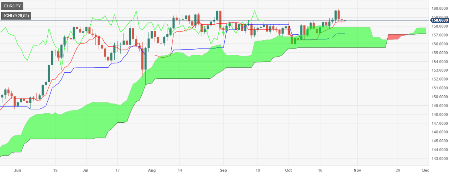 因方向不明,欧元/日圆保持区间震盪,但略微倾向于上行。这是因為欧元/日圆位于一目均衡图云图上方。因此,第一个阻力位在 159.00 ,然后是10 月 24 日的日高点 159.91 点。突破该水准后,欧元/日圆可能会交投于 160.00 上方。