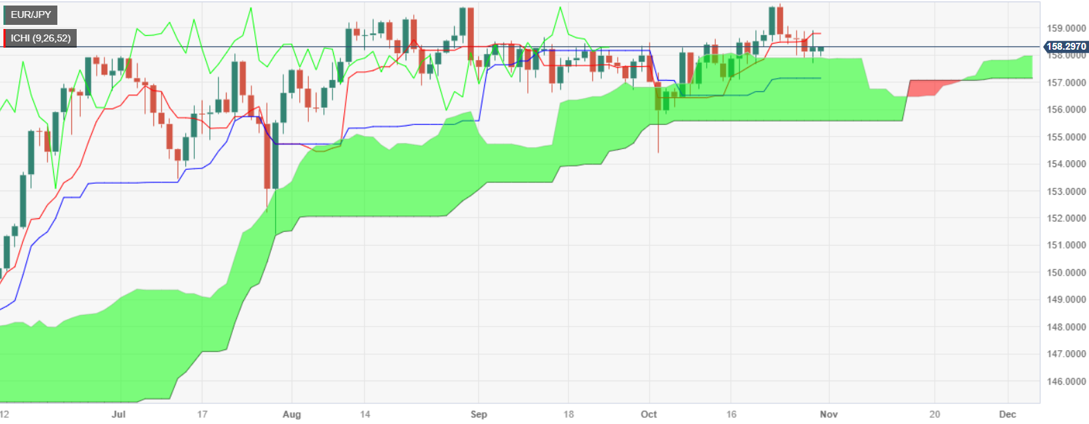 - 欧元/日圆交投于一目均衡云图顶部附近,第一支撑位在 158.00。