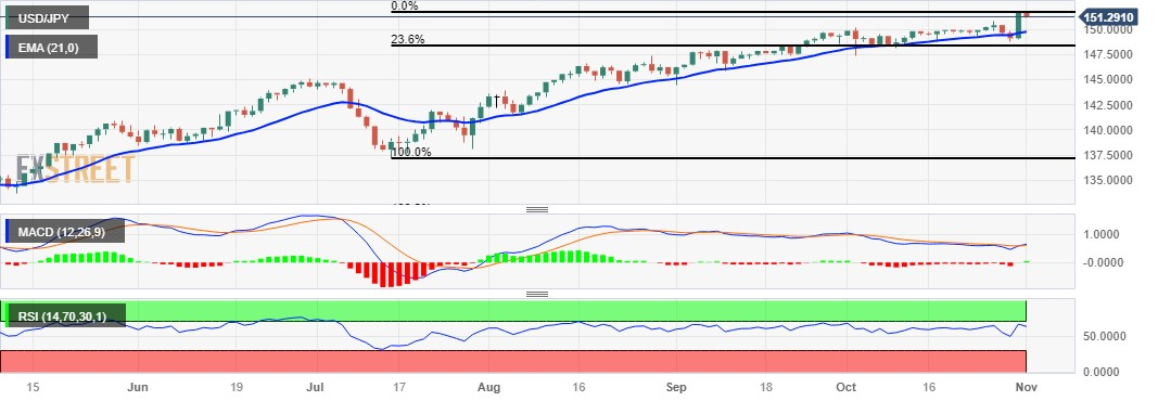 - 关键支撑位151.00的重要水平,然后為21日EMA均缐