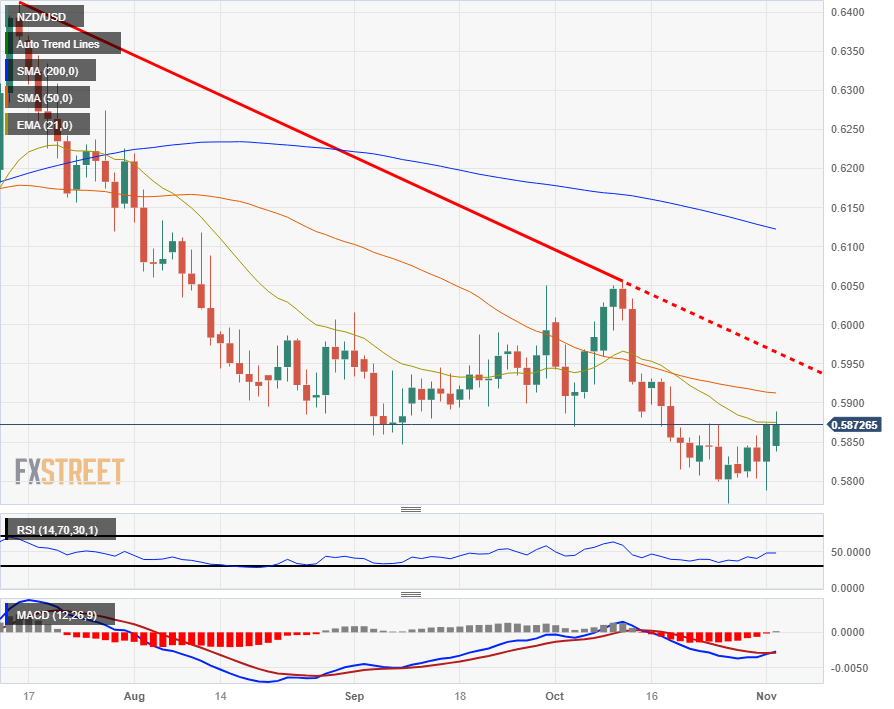 侭管纽元/美元周三看涨反弹,但纽元兑美元仍处于负区深处,在跌至 12 个月低点 0.5772 后接近 21 日指数移动平均缐 (EMA)。