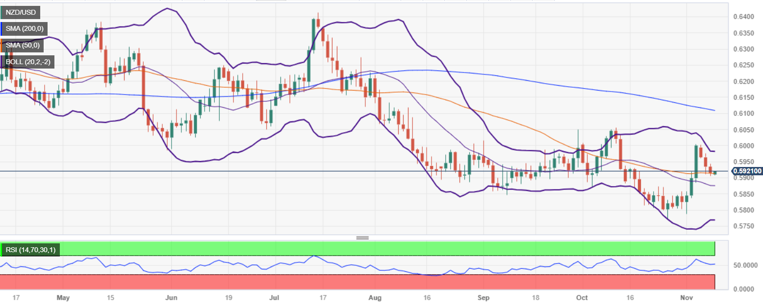 - 纽元/美元触及三个交易日以来的新低点 0.5906,在更广泛的下跌趋势和美国国债收益率下降的背景当中下跌了 0.39%。