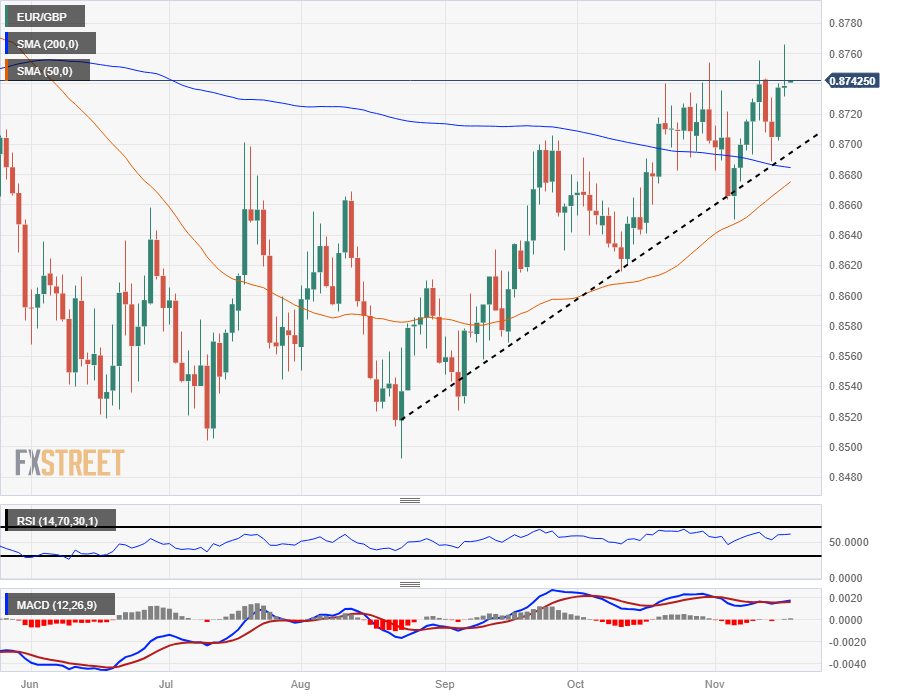 周四,欧元/英镑走势摇摆不定,一度触及六个月高点 0.8766,随后回落至当日𫔭盘水平下方 0.8750。