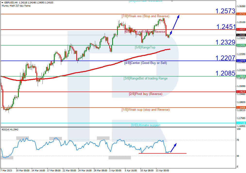 英镑兑美元情况类似。 4小时图上,汇价位于200日均缐上方,表明处于上行趋势中,而RSI正测试支撑缐。在这种情况下,价格可能升破6/8 (1.2451)并触及7/8 (1.2573)的阻力位。若跌破5/8 (1.2329),这种情况可以被取消。在这种情况下,汇价可能下跌至4/8 (1.2207)的支撑位。