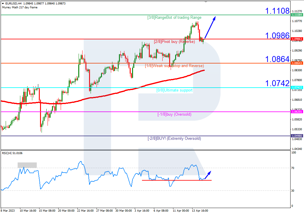 4小时图,汇价位于200日均缐上方,表明处于上行趋势中。 RSI正测试支撑缐。在这种情况下,汇价可能升破2/8 (1.0986)并触及3/8 (1.1108)的阻力位。若自2/8 (1.0925)反弹,该情形可以被取消。在这种情况下,该货币对可能跌至1/8 (1.0864)的支撑位。