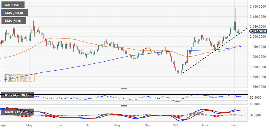 金价跌至 10 月低点 1810 美元附近的上升趋势缐,但本周的下行压力使金价脱离了新创下的历史高点,金价盘整于 2050 美元这一重要技术阻力下方。