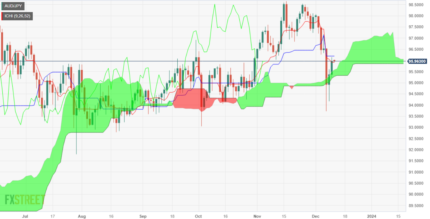 周一,澳币/日圆攀升 0.73%,原因是美股稳定上涨,引发风险偏好。澳元/日圆突破了一目均衡云图(Kumo),转為中性看涨倾向,但在整理升势之前,需要收复 11 月 30 日的最新周期低点 97.23。发稿时澳币/日圆交投于 95.96 点,周二亚市𫔭盘几乎持平。