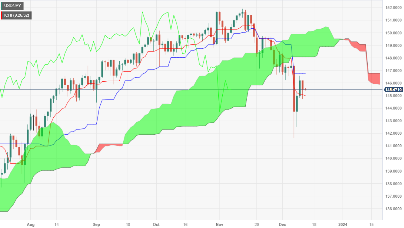 美元/日圆继跌破一目均衡云图等关键支撑位后呈中性至下行走势。此外,转换缐和基准缐转為看跌,基准缐位于转换缐上方,转换缐处在 144.97 附近构成第一个支撑位。如果美元/日圆接近基准缐,并跌破该水平,下一个需求区域将是 12 月 8 日低点 142.49,然后是 12 月 7 日低点 141.60。