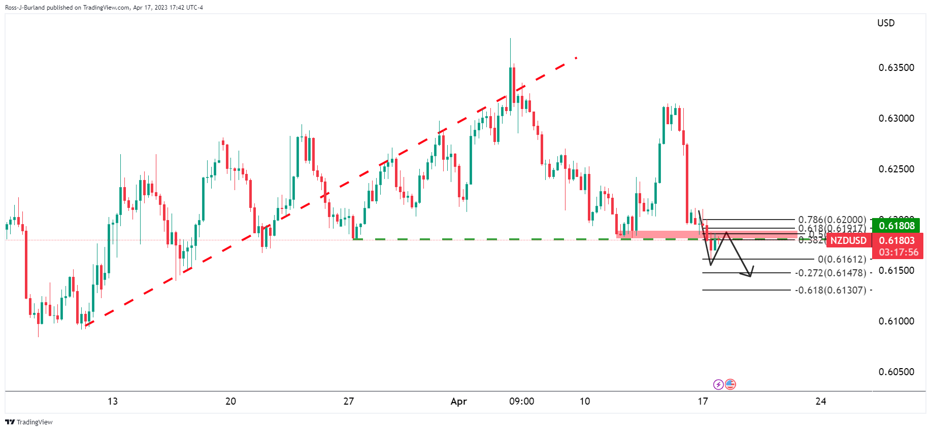 空头介入,由于纽元/美元跌破形态,纽元/美元正寻求下跌,指向0.6150水平。