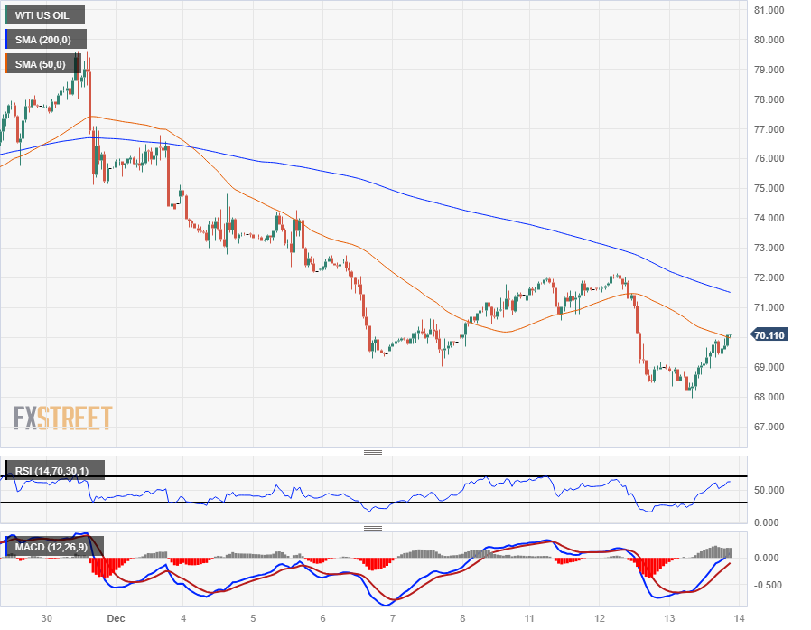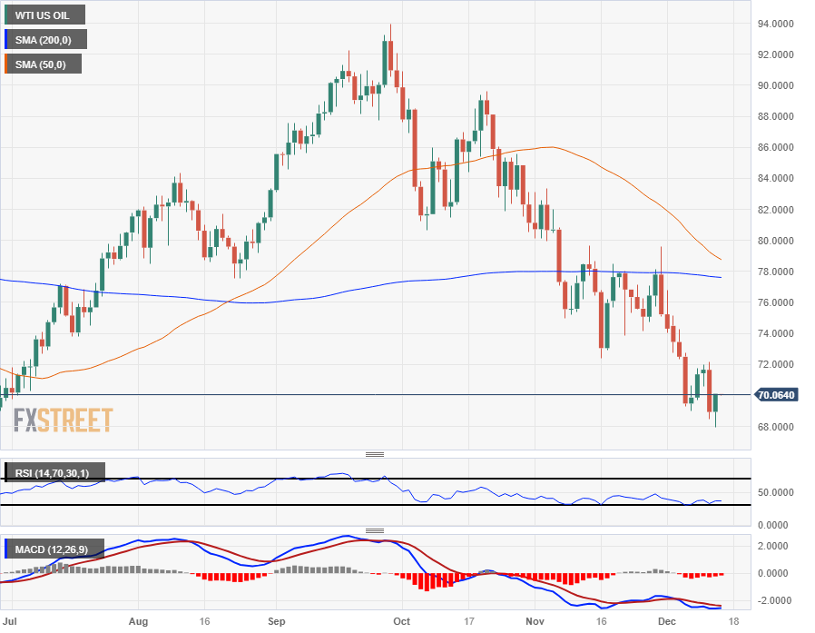 周三WTI油价反弹,WTI油价攀升至 70 美元,但随后仍深陷跌势,交投于 71.50 美元附近的 200 小时简单移动均缐(SMA)下方。 12 月初,WTI油价从 76.50 美元跌至 200 小时移动均缐附近,自此之后,WTI 油价再也没有接近 200 小时移动均缐。