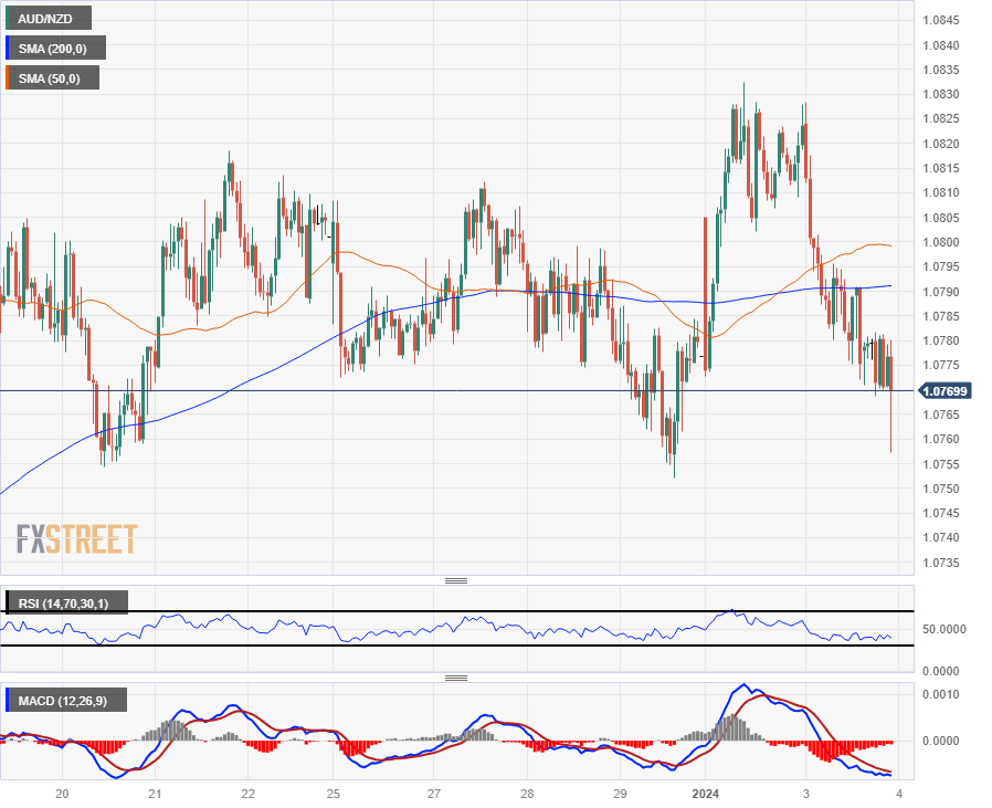 澳元/纽元周三走势摇摆不定,从略低于 1.0830 的近期高点跌至近期低点 1.0770 附近,周四早盘短暂测试 1.0760。