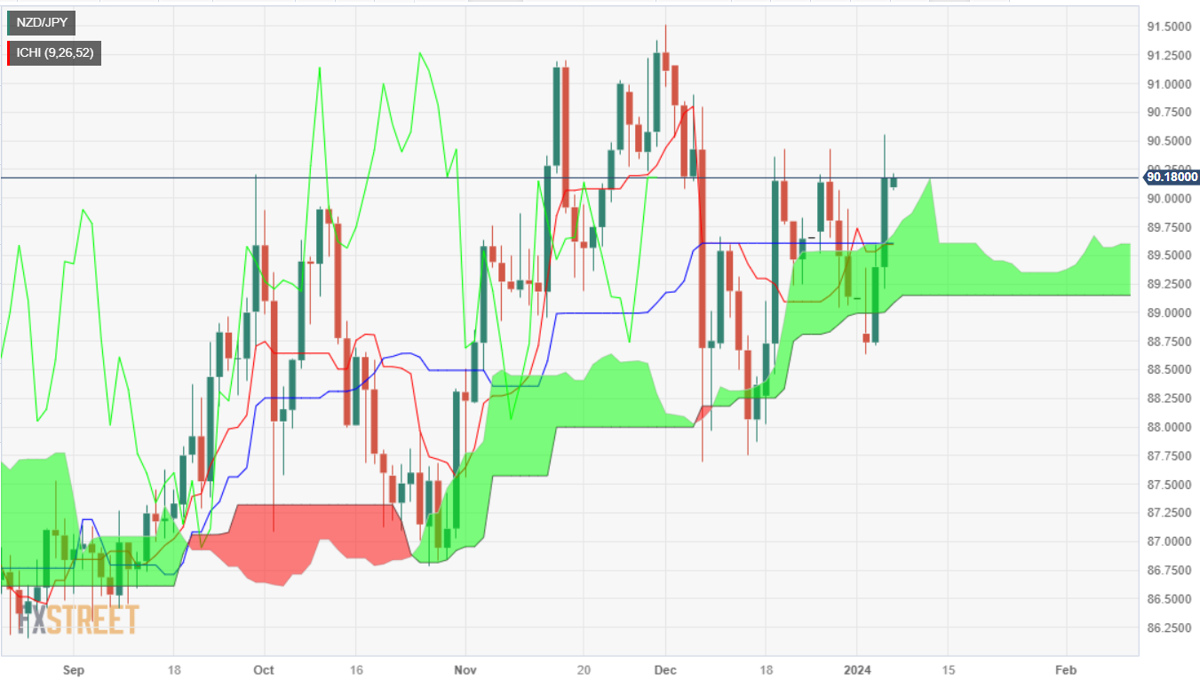 日圆(JPY)全盘走软,纽元/日圆周四大幅飙升,涨幅超过 0.70%。在此过程中,纽元/日圆突破了一目均衡云图(Kumo),转為看涨,显示多头占主导。亚洲交易时段𫔭盘后,纽元/日圆交投于90.14附近,微跌0.01%。