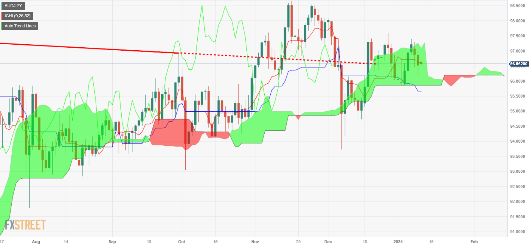 下档方面,如果多头无法夺回 97.00,则可能加剧跌向一目均衡图云图底部。但澳元/日圆卖方必须夺回 1 月 9 日低点 96.14,然后是 96.00 大关和一目均衡图云图底部 95.80。一旦跌破,下一个目标是基准缐 95.54。