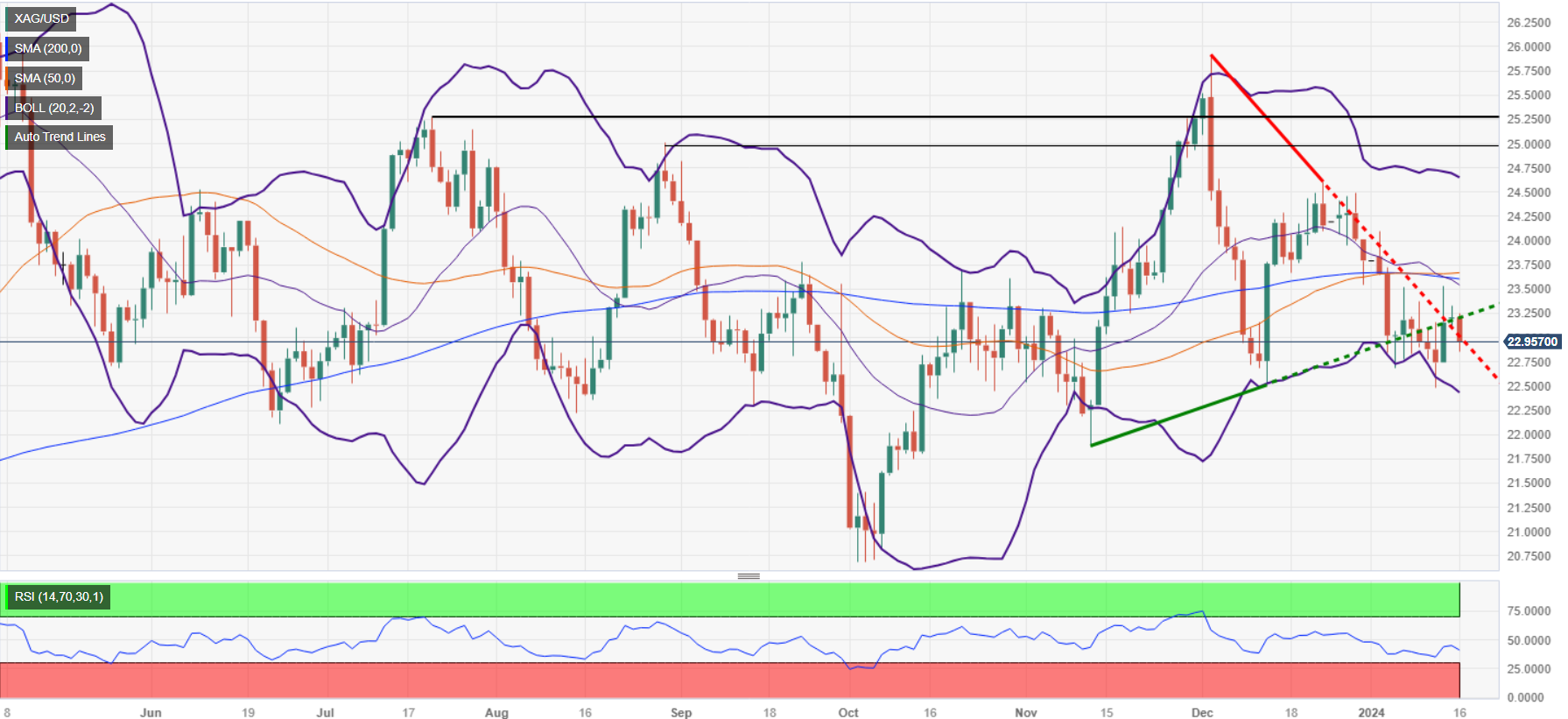 银价跌破每盎司 23.00 美元,日内下跌 1%,原因是美联储 (FED)官员回击 3 月份降息预期,导緻美国国债收益率飙升 。因此,零收益资产银价下跌并创下了两天来的新低,处在22.86 美元附近。