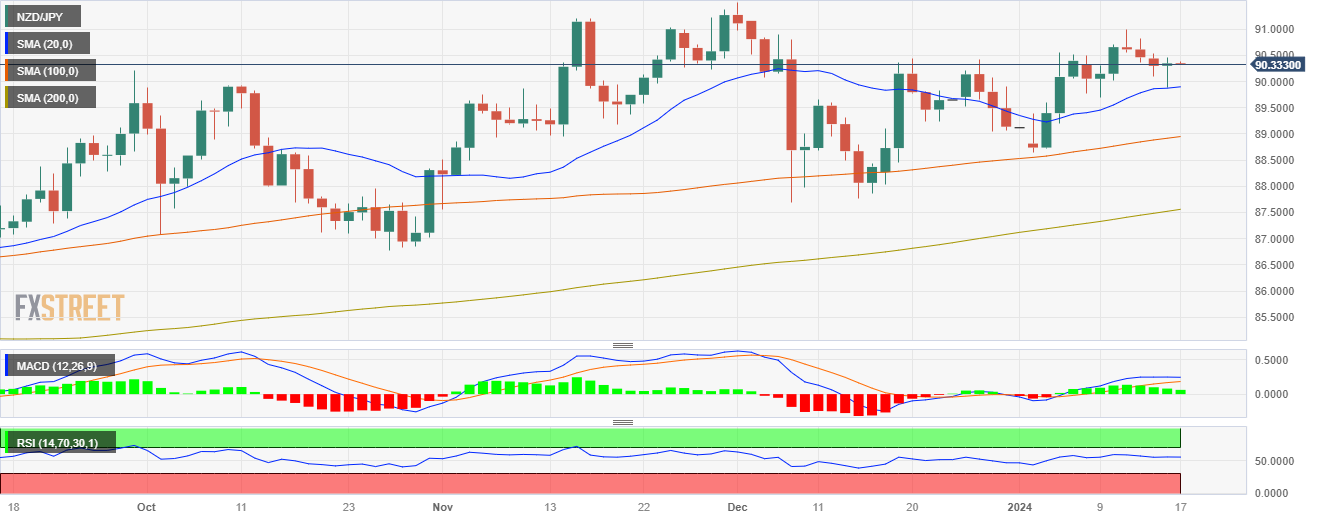 周二盘中,纽元/日圆位于90.33,继盘初跌至89.90后出现轻微回升。整体而言,日缐技术图表呈现中性至看涨的前景,多头牢牢守住了自己的地盘。同样,4小时图也体现了这一看涨优势,显示出𧹒方目前的力量。
