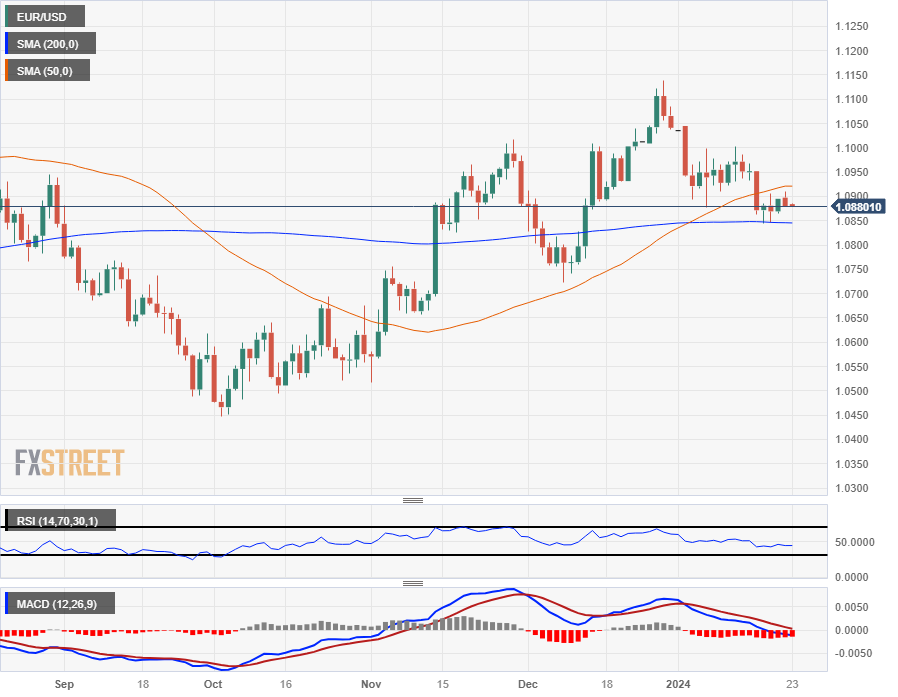 欧元兑美元周一走势摇摆不定,跌至 1.0880 附近,眾央行将公布利率决议,市场面临调整交易方向的风险。欧洲央行(ECB)将于周四发表货币政策声明,尤其值得关注。
