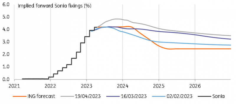 在欧洲,市场情绪也仍倾向于加息。英国昨日公布的通胀数据比预期更具粘性,市场重新定价了对英国央行(boe)政策利率的预期。 CPI数据公布后,市场现在认為英国央行5月加息25个基点已成定局。此外,终端利率上调逾15个基点,这意味著市场目前预计至少还会有三次加息。我们的经济学家们不那麽确信,但市场情绪显然倾向于更长时间的高企。
