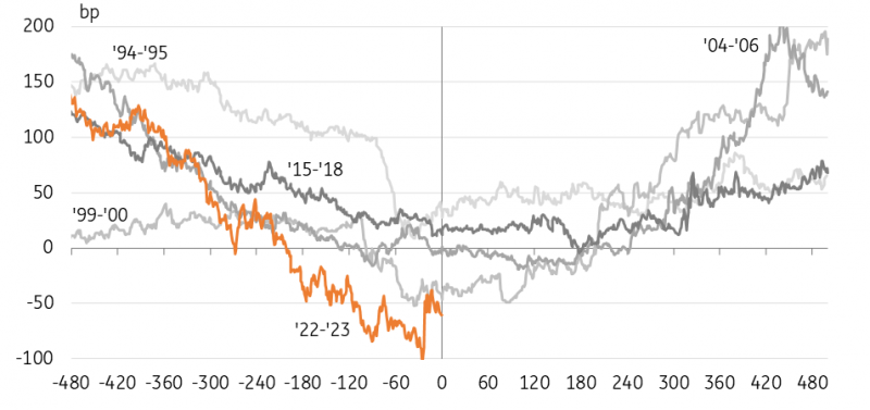 考虑到更广泛的情况,美联储很快从加息转向维持利率不变,仍将标誌著一个重要的转折点。从历史上看,在这个阶段,10年期国债收益率已经见顶,趋平趋势也趋于消退。利率趋平仍有发生,但通常是罕见的,而且只是在美联储达到政策利率峰值后的暂时现象。然而,只有在第一次实际降息出现后,重新加息才获得了动力。