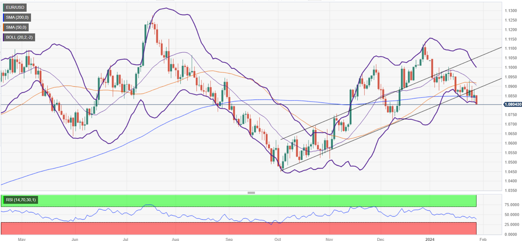 欧元兑美元周一扩大跌幅,在美国联邦公𫔭市场委员会(FOMC)决议前的平静交易时段,𧹒家努力将汇价维持在1.0800上方。美国公债殖利率下降并不能成為美元多头放弃美元的理由;因此,欧元兑美元交投于1.0809,跌幅為0.39%。