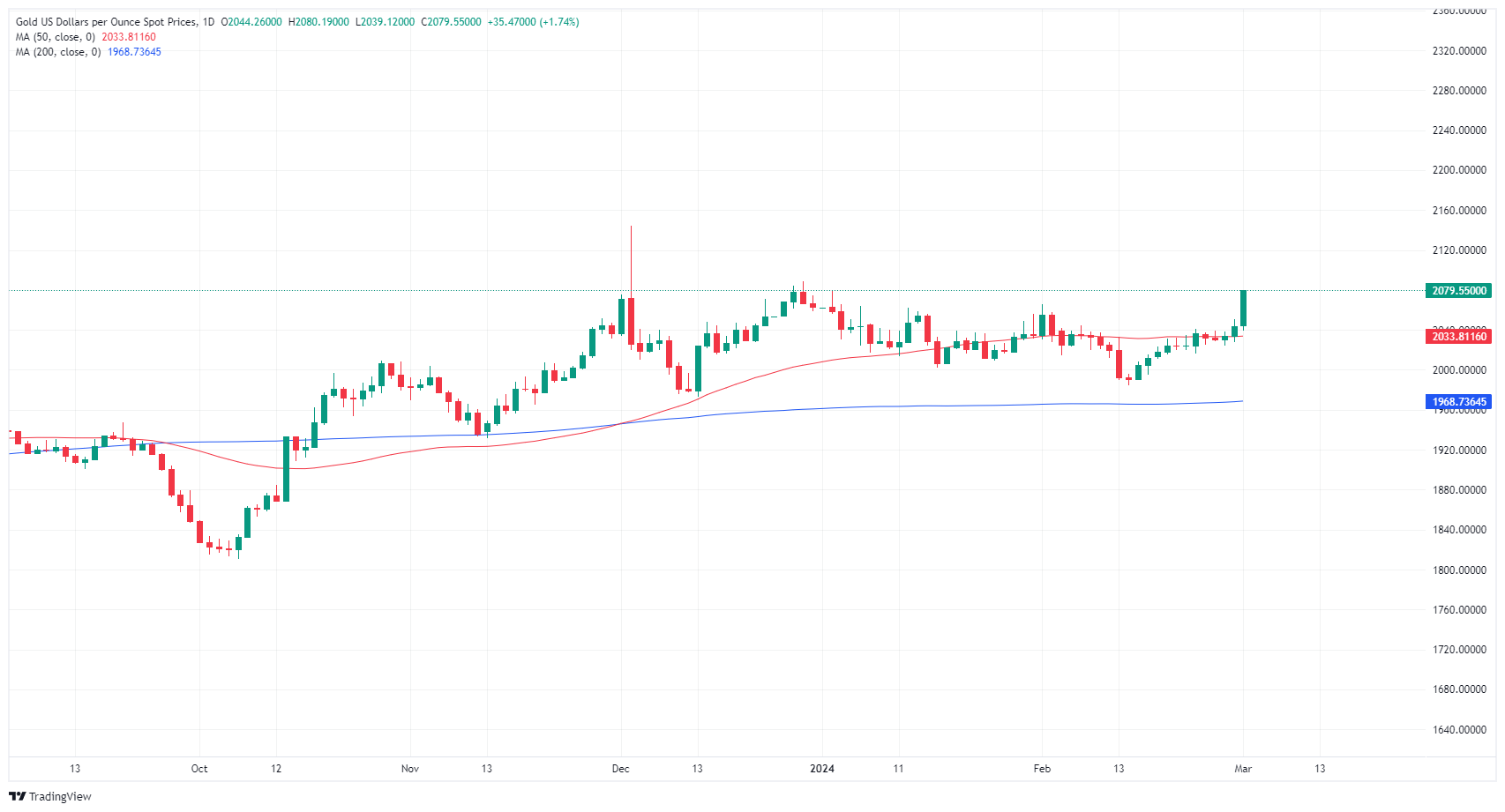 XAU/USD日烛台缐将突破 2,100.00 美元的价格关口,突破后最近的技术上限位于 12 月初创下的历史高点 2,144.48 美元附近。