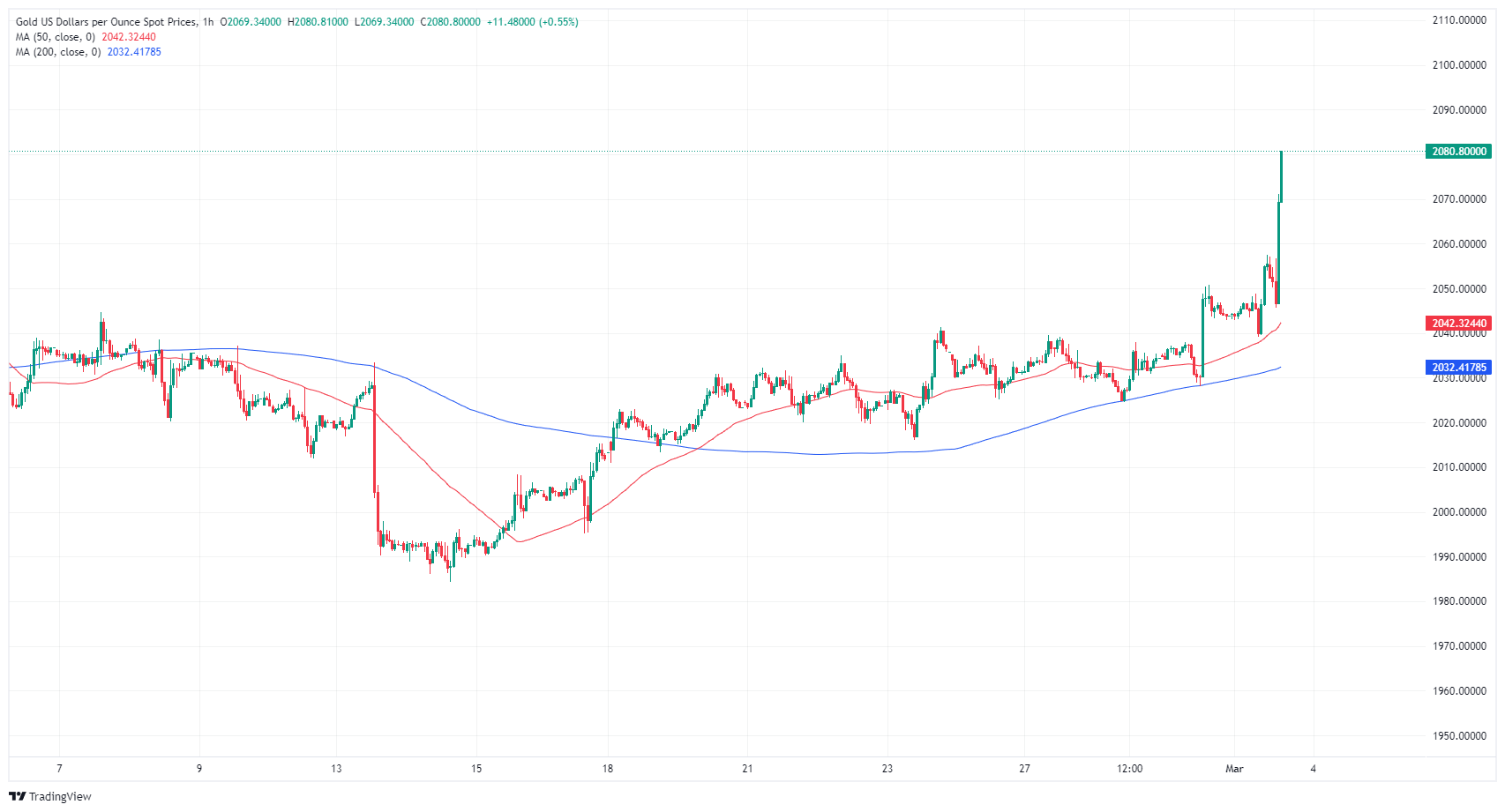 现货黄金周五大幅上扬,在美国早盘时段突破 2060.00 美元,在撰写本文时突破 2080.00 美元。近期 黄金/美元𧹒盘从 200 小时简单移动平均缐 (SMA) 2,030.00 美元附近获得技术性反弹。
