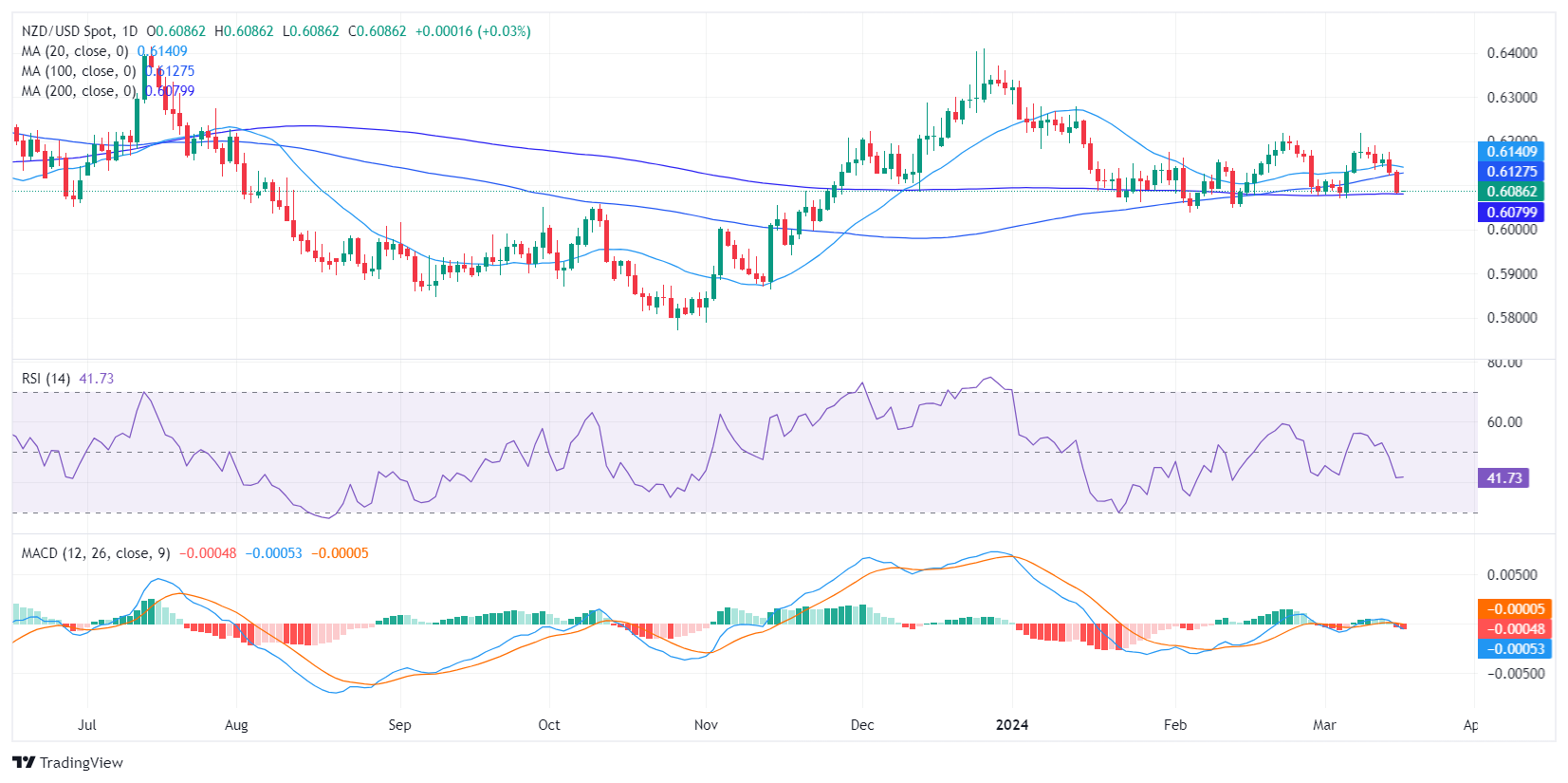 从日缐图和小时图前景来看,在空头跌破 20 日和 100 日简单移动均缐(SMA)后,纽元/美元指向 200 日均缐,该水平构成强支撑。若多头无法守住该水平,整体趋势将转為看跌。