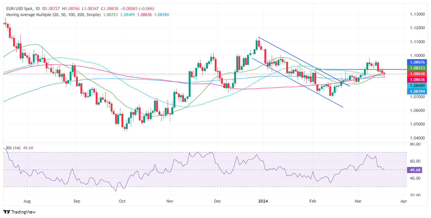 市场参与者在观望联准会周三货币政策决议,欧元兑美元仍处于守势。因此,欧元兑美元交投于 1.0859,跌幅為 0.12%。