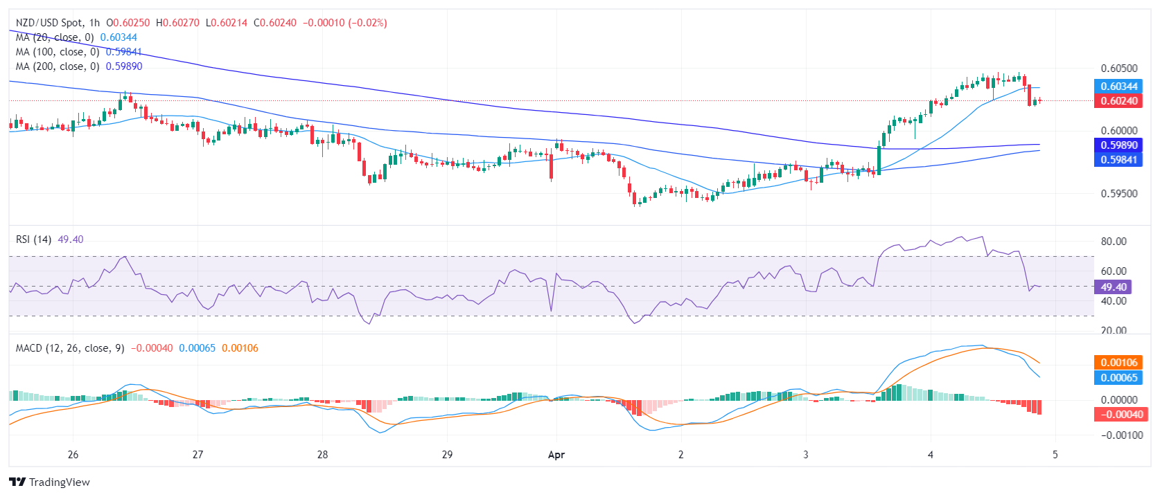 小时 图显示,相对强弱指标更加不稳定,盘初曾达到 70 的正值,随后跌至 50。这种波动表明,短期动能可能转向有利于卖方。 MACD 指标红柱持平,显示最近几个小时看跌势头持续。