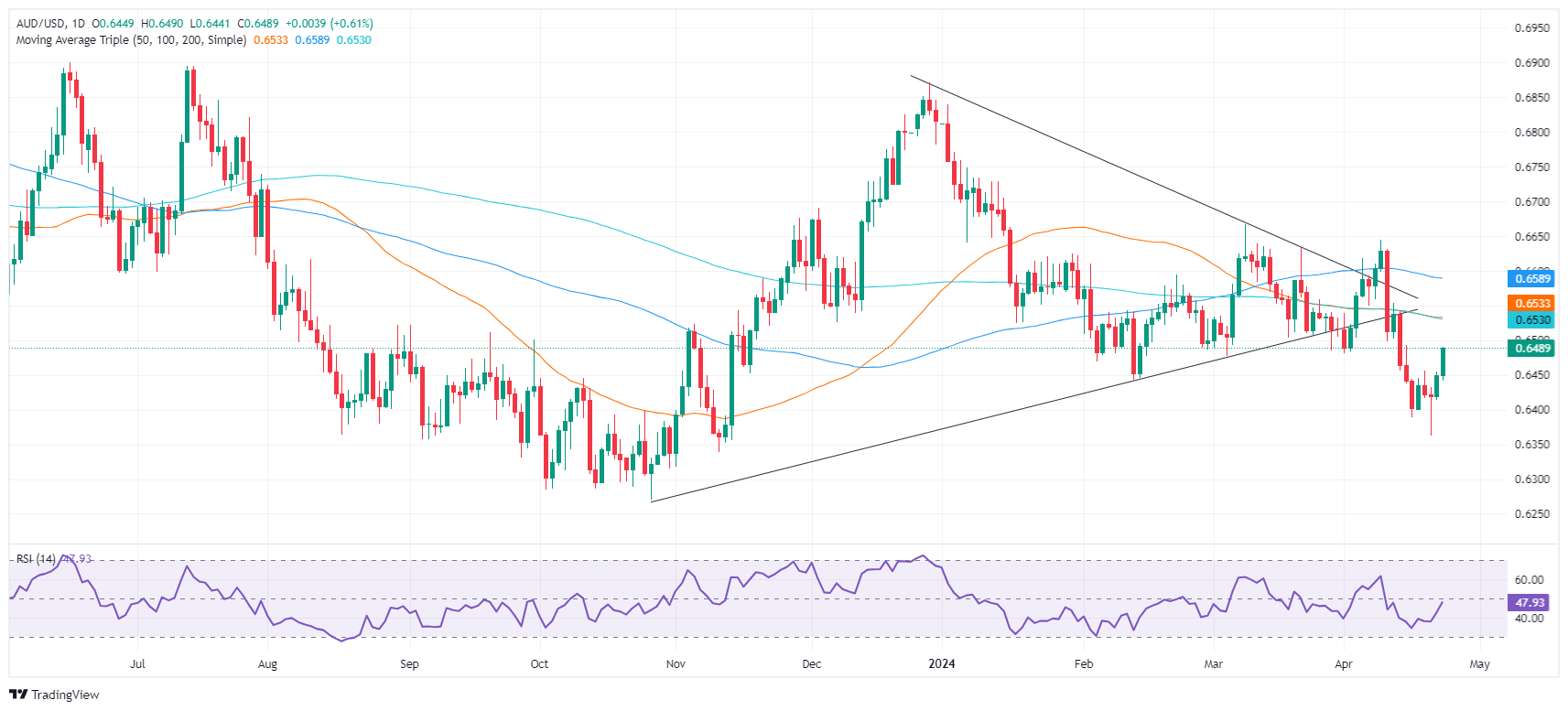 周二公布的美国 4 月标准普尔采购经理人指数(PMI)弱于预期,澳元兑美元连续两天上涨,并攀升 0.59%。继上周联准会发表鹰派演讲后,这引发了联准会可能重新将降息提上日程的猜测。周三亚市𫔭盘后,澳元兑美元报 0.6488,上涨 0.01%。