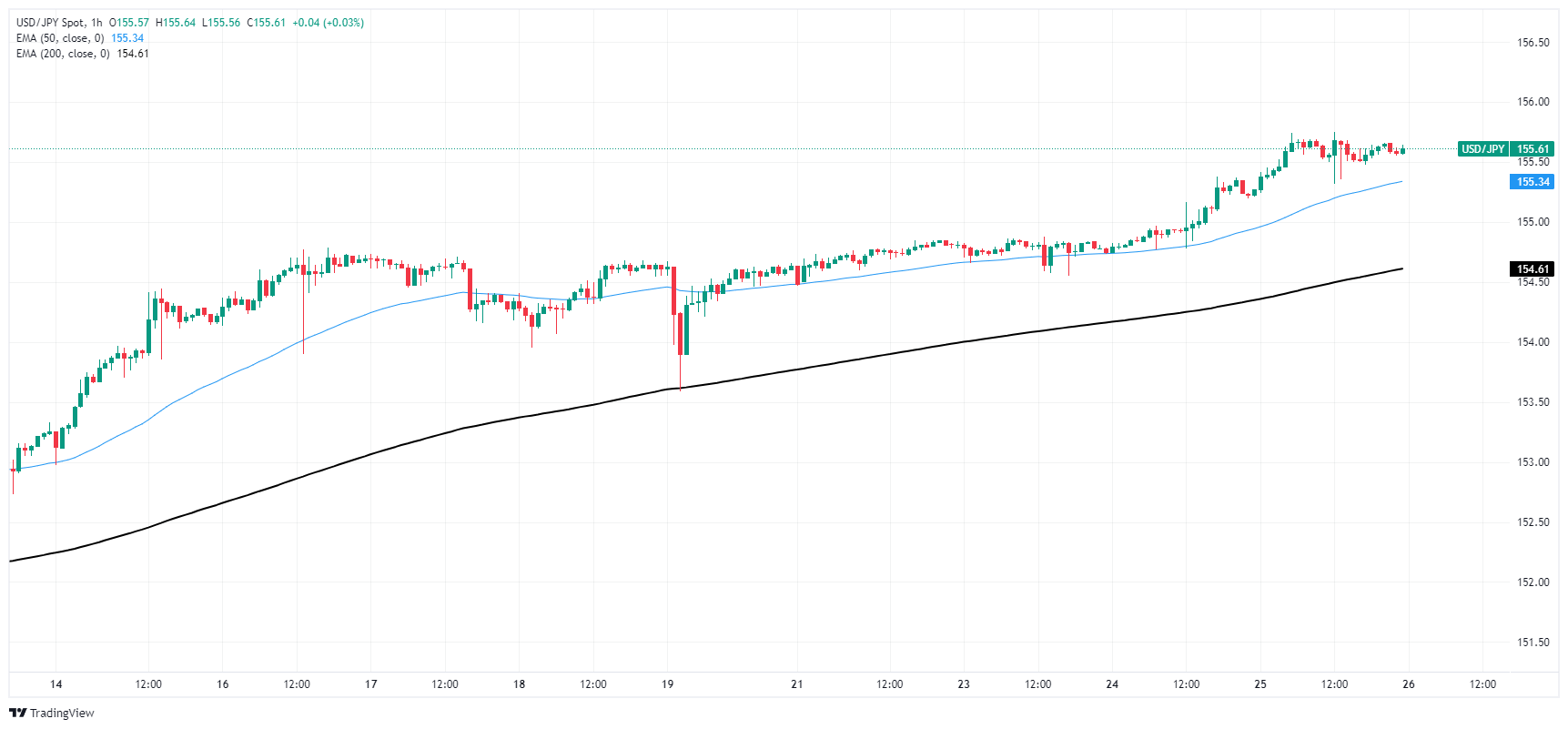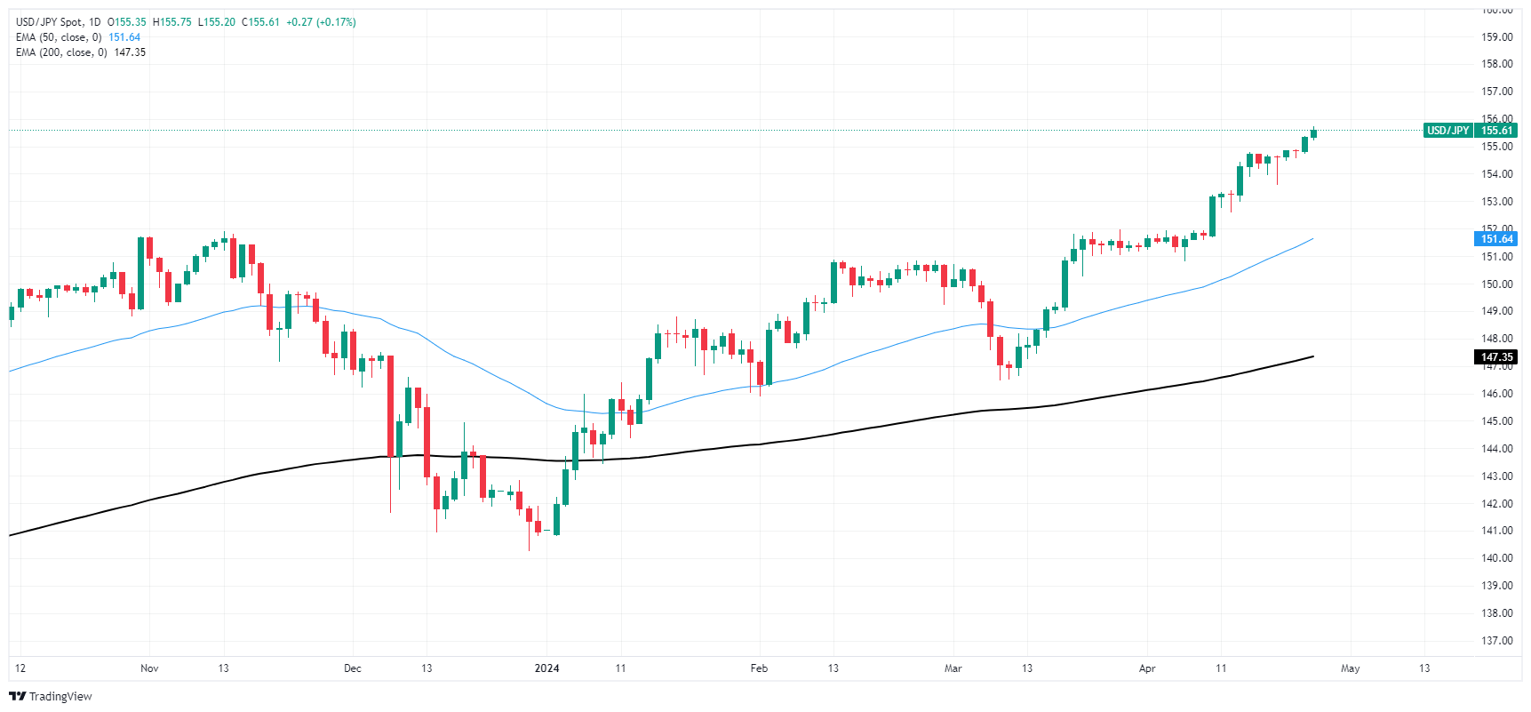 美元/日圆在 156.00 关口下方附近交投,因日圆持续走低而紧紧抓住多年高点。该货币对正进入 30 多年来的高位,看涨势头正瞄准 160.00 以上的历史最高价,这是 1990 年以来该货币对从未达到过的价位。