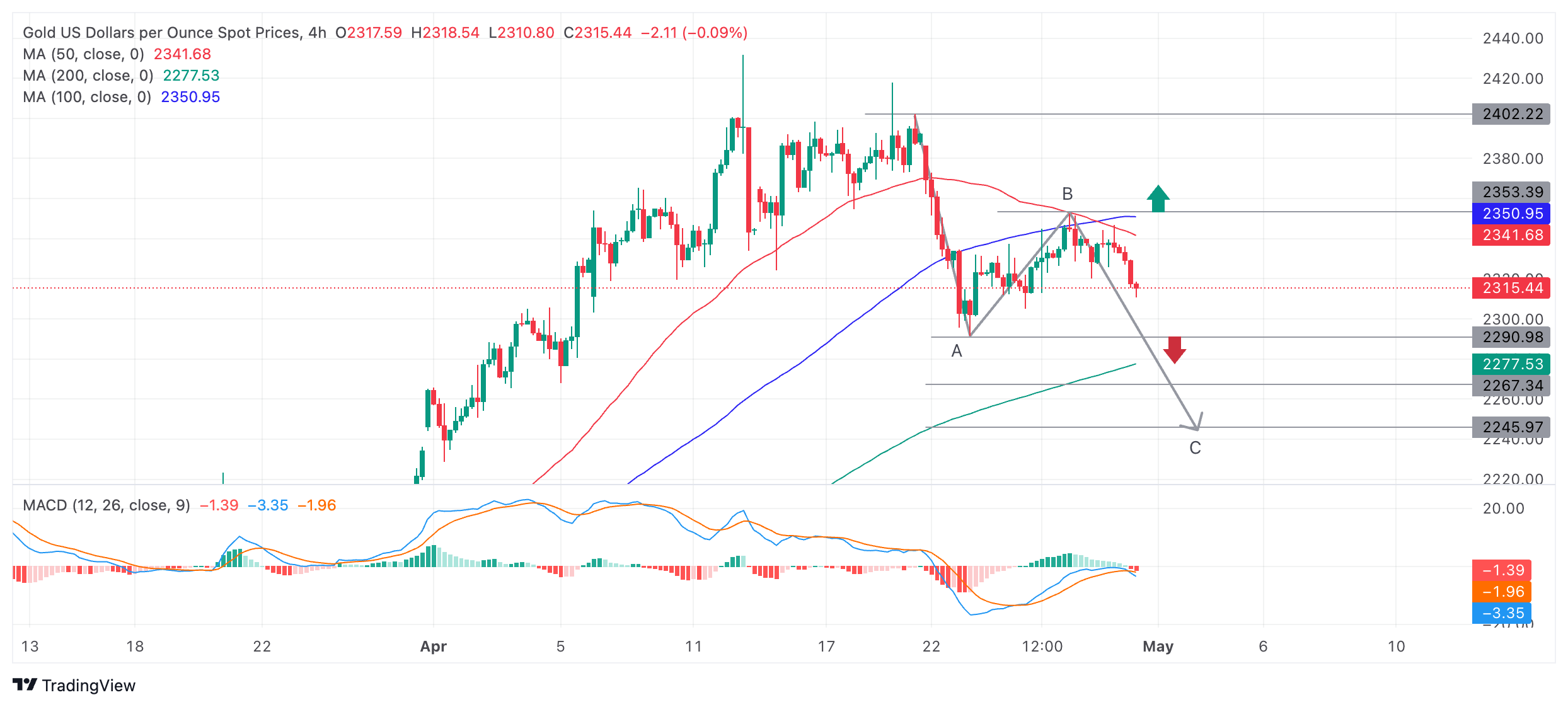 金价(XAU/USD)可能正在展𫔭“测量移动(Measured Move)”价格形态的最后一波下跌,这在技术分析师用来分析短期趋势的4小时 图上最為明显。