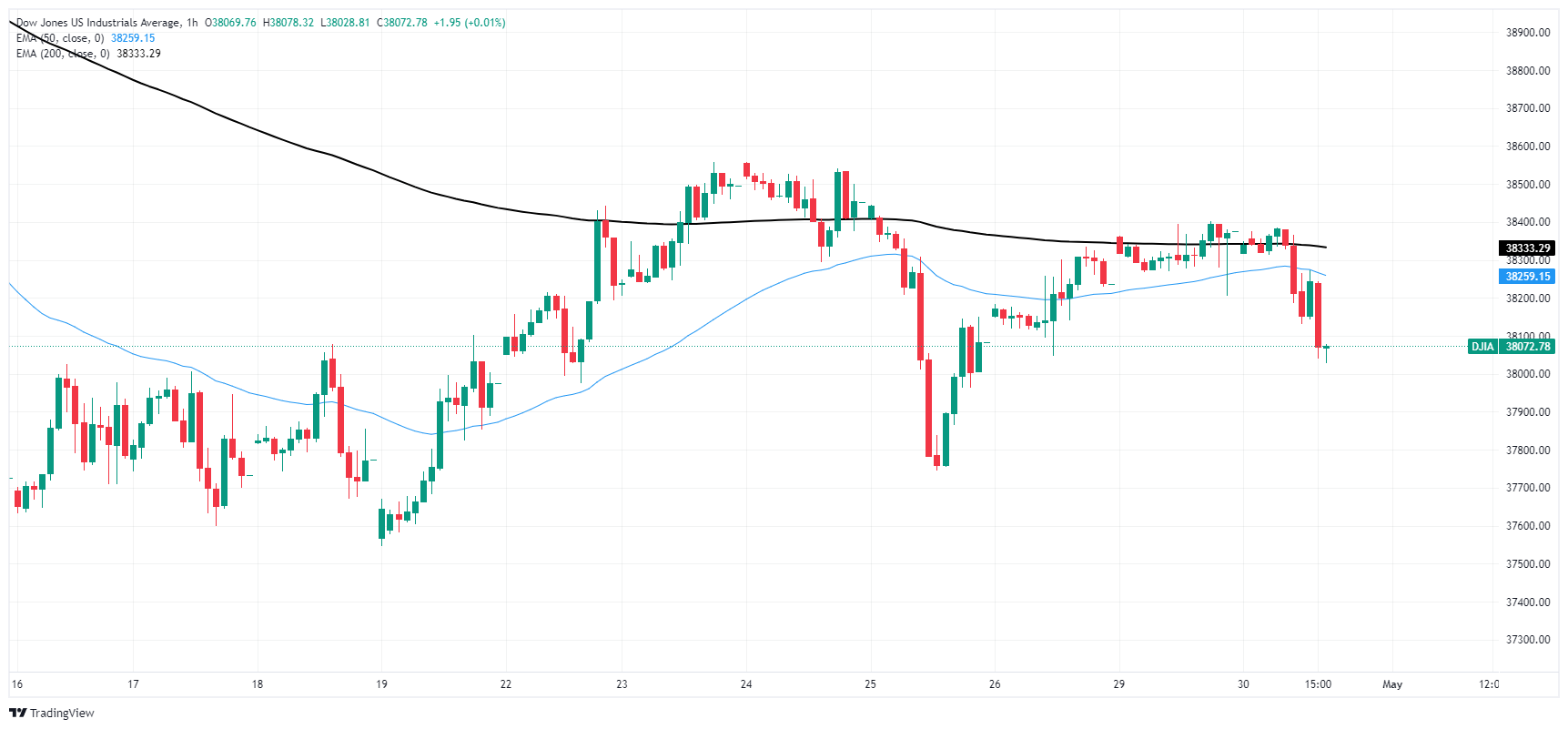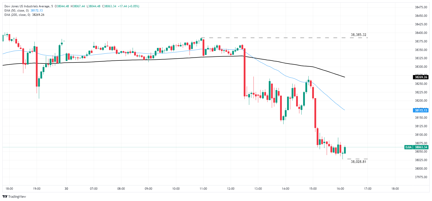 道琼指数周二早盘创下 38,385.32 点的高点,随后避险情绪笼罩投资者,拖累道琼工业指数跌至 38,028.81 点的低点。主要股指预计将继续跌破 38,000.00 点。