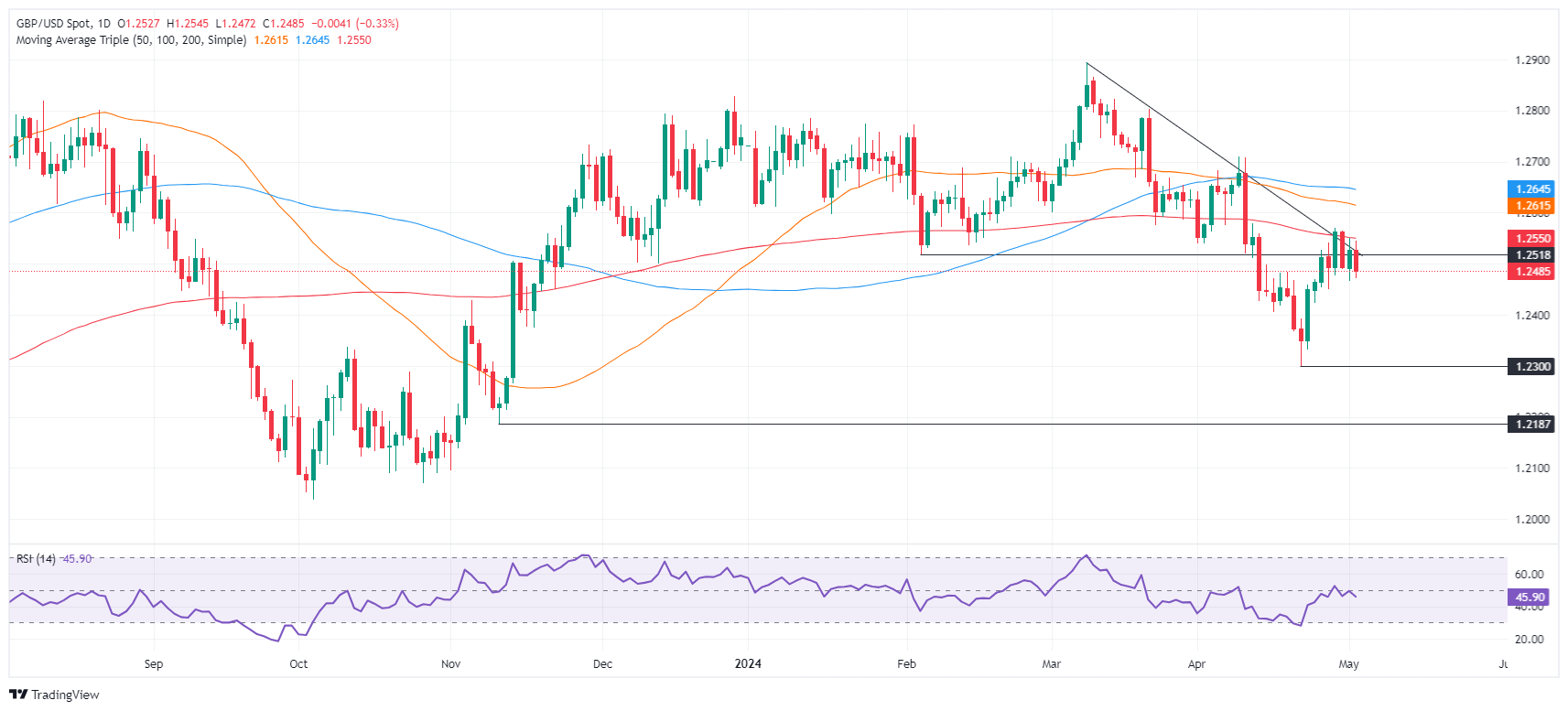 从技术面来看,英镑兑美元呈现中性至下行趋势。这是因為𧹒方未能突破 200 日移动均缐 (DMA) 1.2550 的重要阻力位。这一失败进一步加剧了英镑兑美元跌至 1.2500 下方,有可能為测试 4 月 22 日低点 1.2299 点的最新周期低点铺平道路。