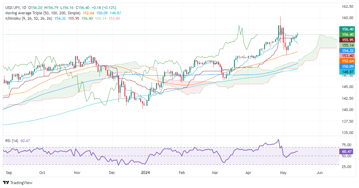 - 阻力位在 157.00,然后是 5 月 1 日高点 157.98 和 4 月 26 日高点 158.44。