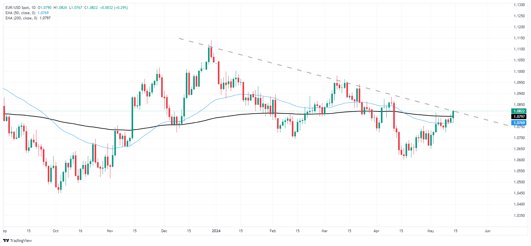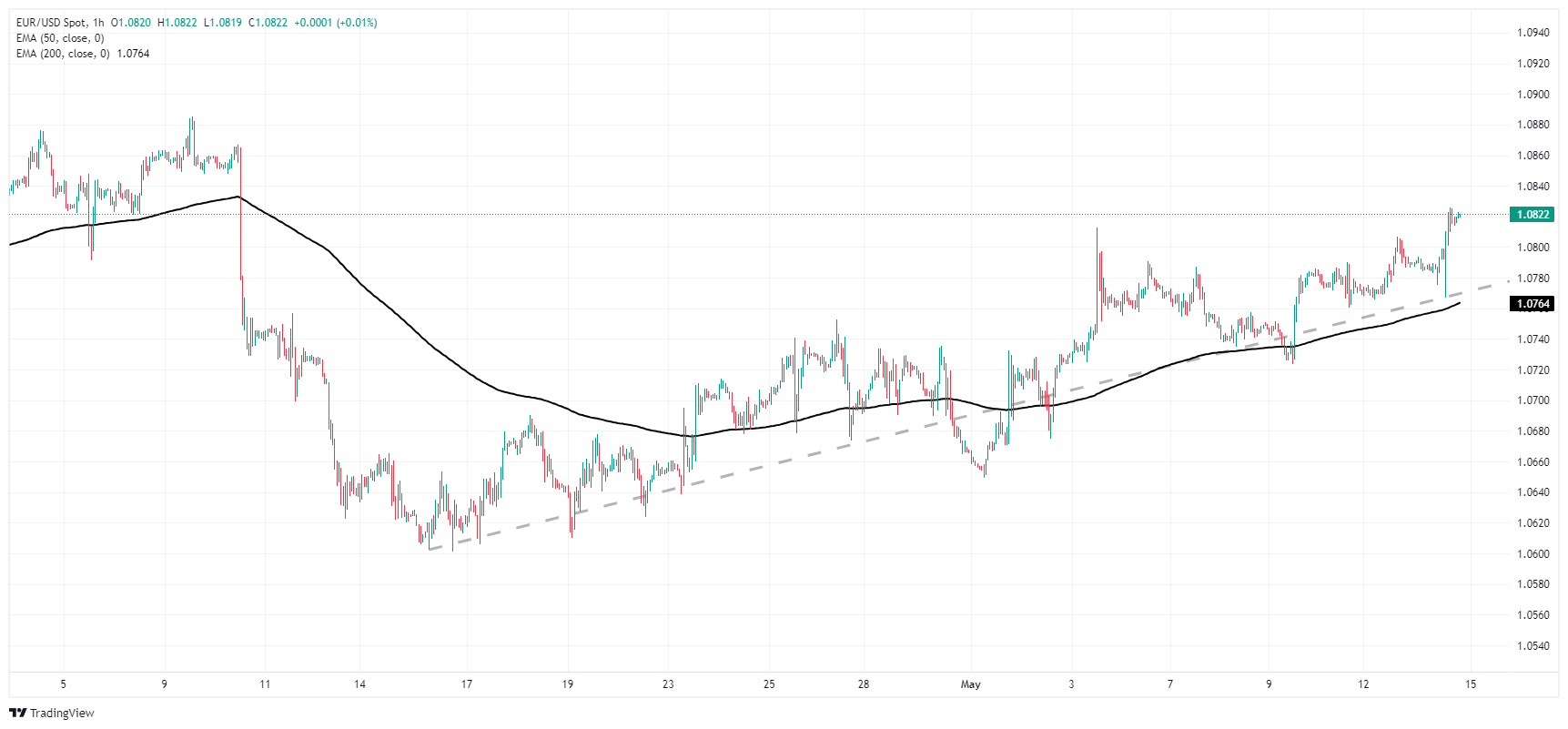 欧元兑美元周二的跳涨将欧元兑美元进一步拖入近期看涨区域,回升至1.0800上方,并触及该货币对自4月初以来的最高水平。自 4 月中旬以来,欧元兑美元从上一个主要波段低点 1.0600 关口震盪回升,涨幅超过 2%。