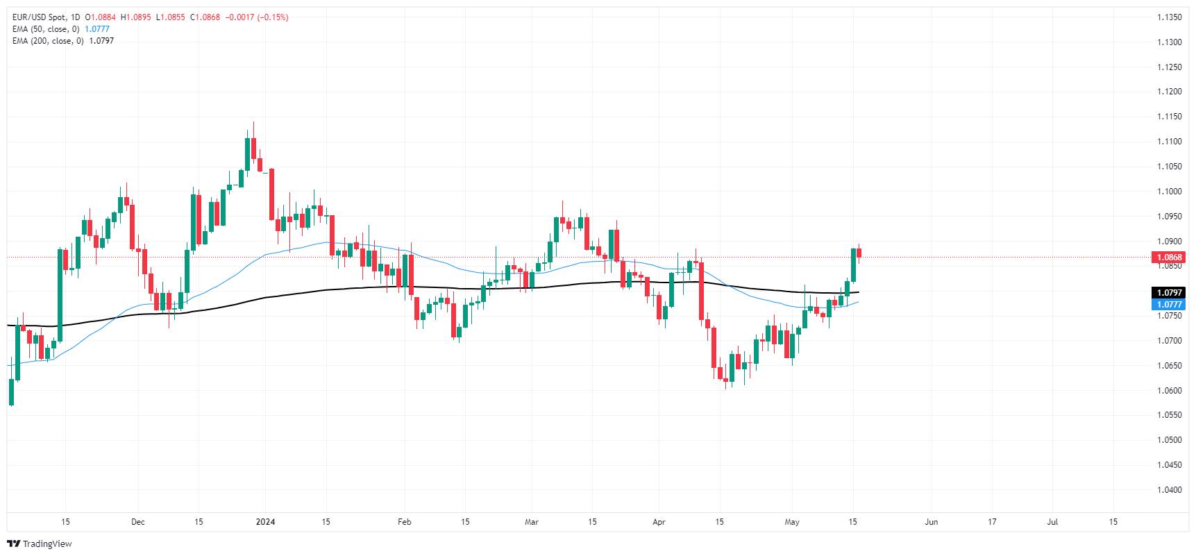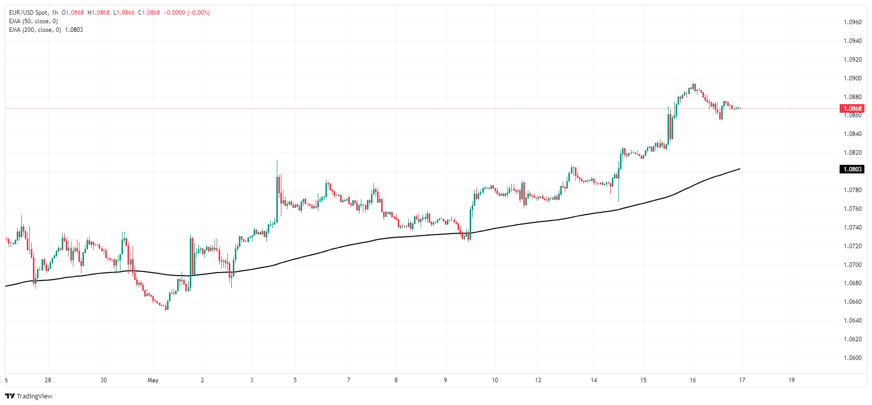 欧元兑美元收窄一些涨幅,周四短暂回落至1.0860下方,但欧元兑美元近期仍明显看涨,交投于200小时指数移动均缐(EMA)1.0802上方。欧元兑美元正在测试 3 月中旬以来的最高𧹒入价,预计将连续四周收涨。