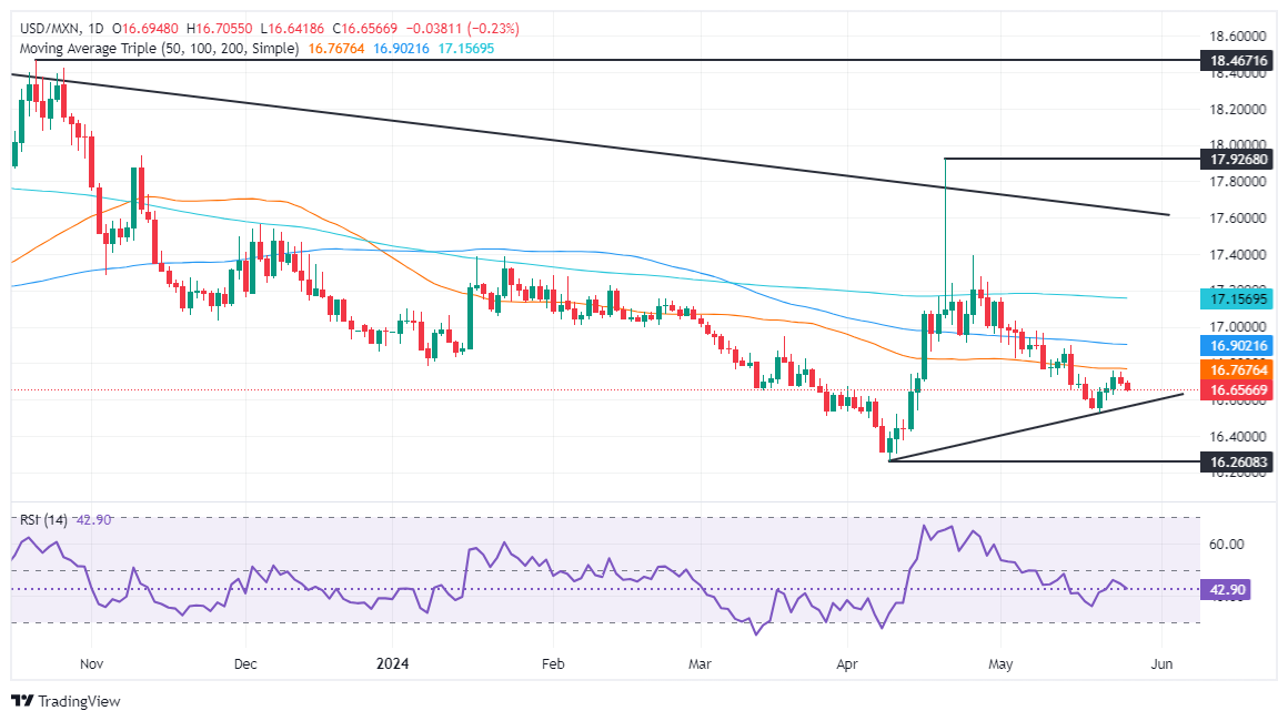 在𧹒方未能突破 16.76 的 100 日均缐后,美元/墨西哥比索跌势延续,随后跌破 16.70 的心理关口。由于相对强弱指数(RSI)向下指向看跌区域,动能有利于卖方。