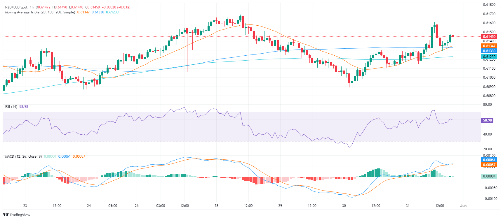 纽元/美元出现上涨,最高上探至0.6160,随后在0.6145企稳,进入盘整阶段。