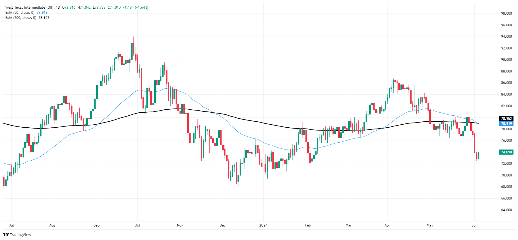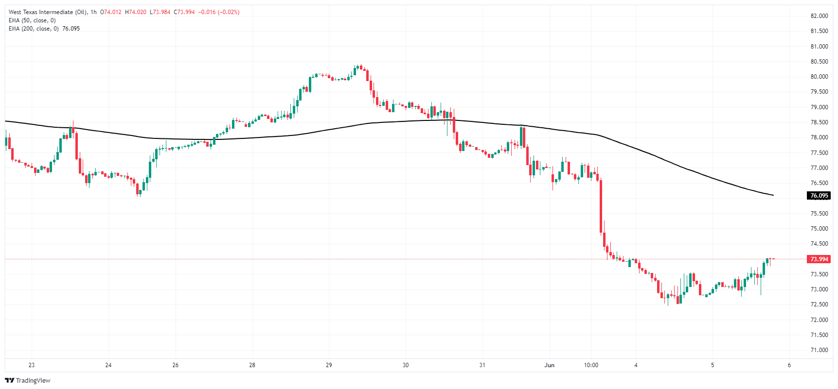 周三,WTI油价𧹒盘走强,反弹至 74.00 美元,但上行动力依然不足,美国原油陡然脱离近期高点。日缐蜡烛图连续五个交易日收跌,略现上涨显示原油𧹒盘所能做到的最佳水准。