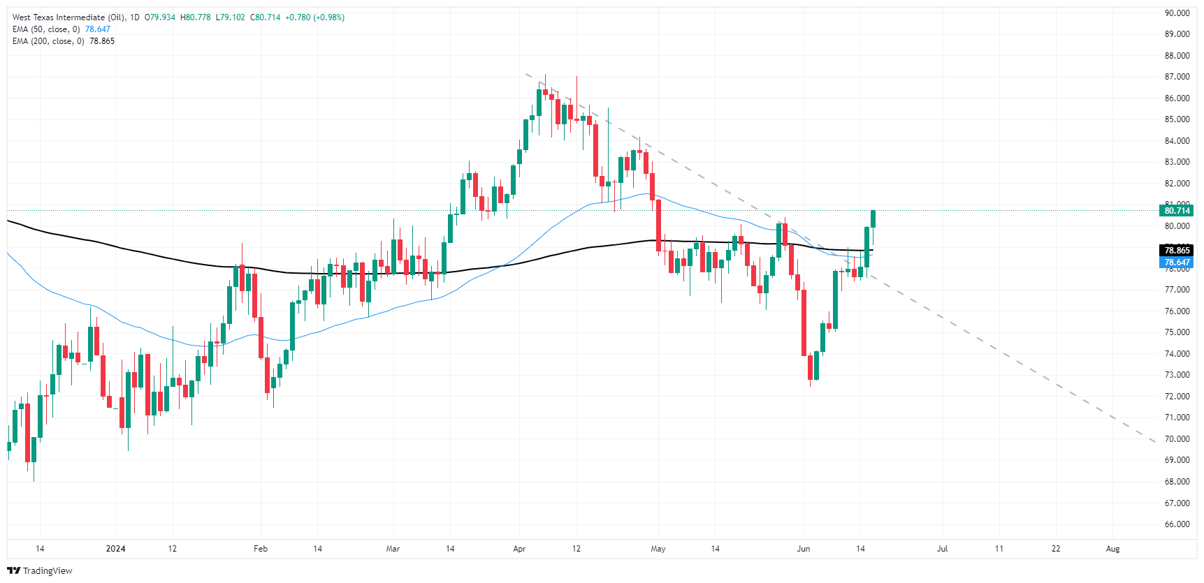 - 周二,WTI 原油攀升至 80.00 美元上方,继续看涨。