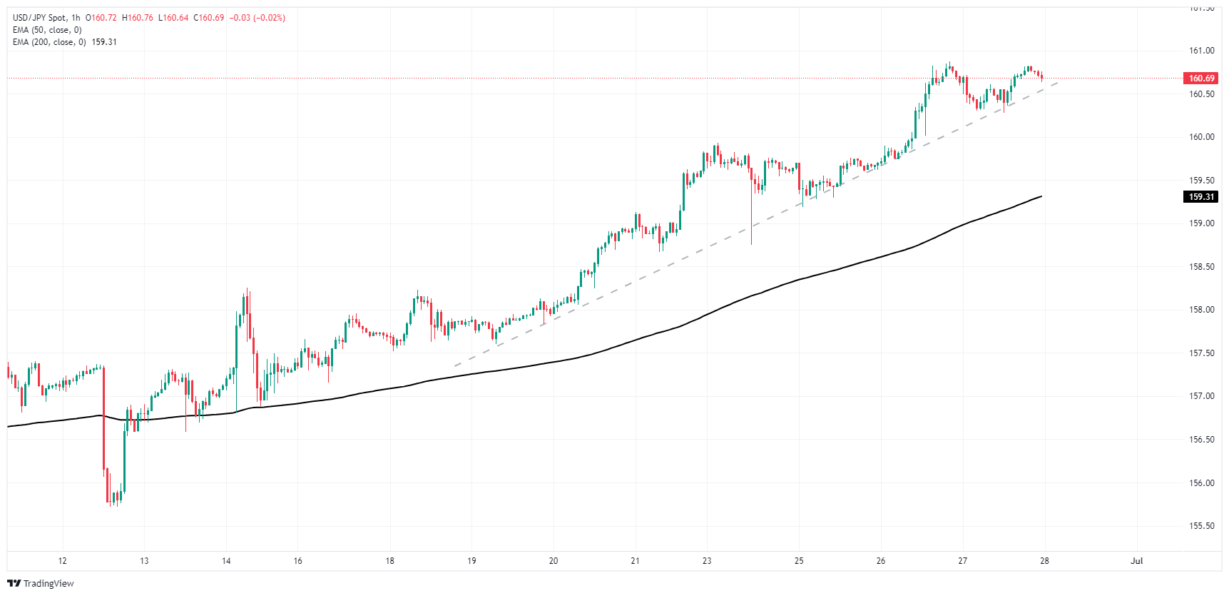 美元/日圆继续紧守 160.80 以上的数十年新高。本周,美元/日圆突破了 1986 年以来的最高水平,创下 38 年新高,而日本通膨数据明显没有上升,这将使日圆持续走低。