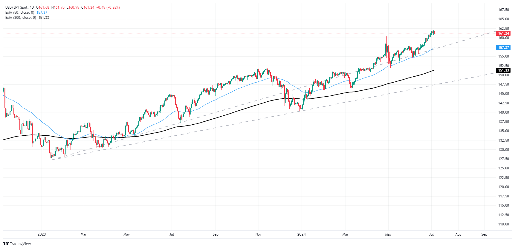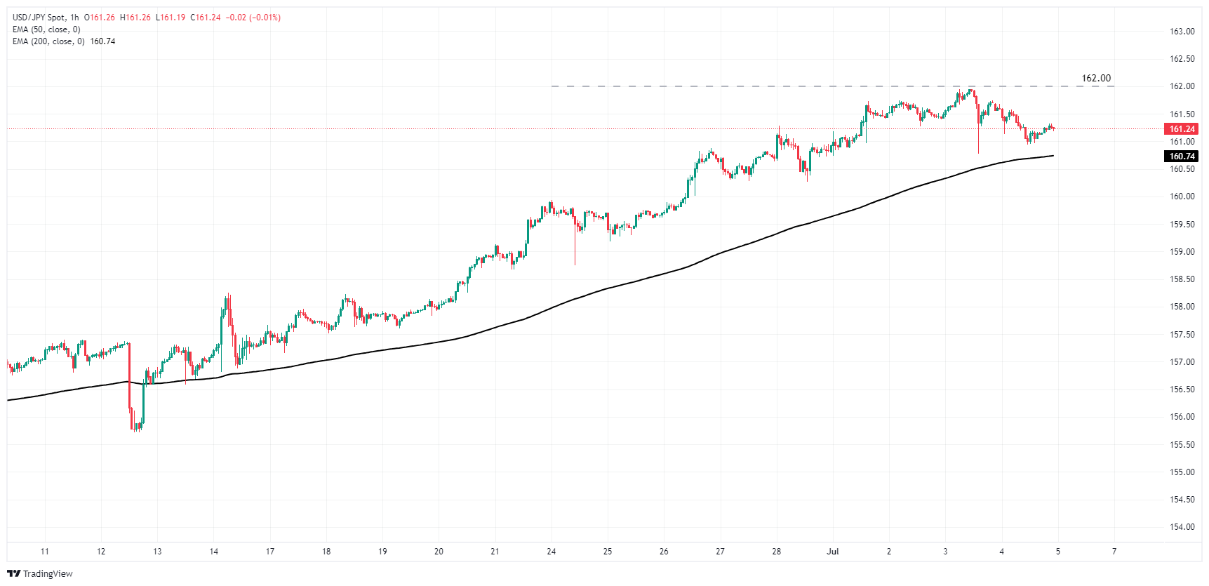 看涨动能已经暂停,盘中𧹒盘从本周稍早创下的四十年高峰略有回落。除了 162.00 这个关卡可能被𧹒家视為目标而非阻力外,目前还没有看到进一步技术阻力。