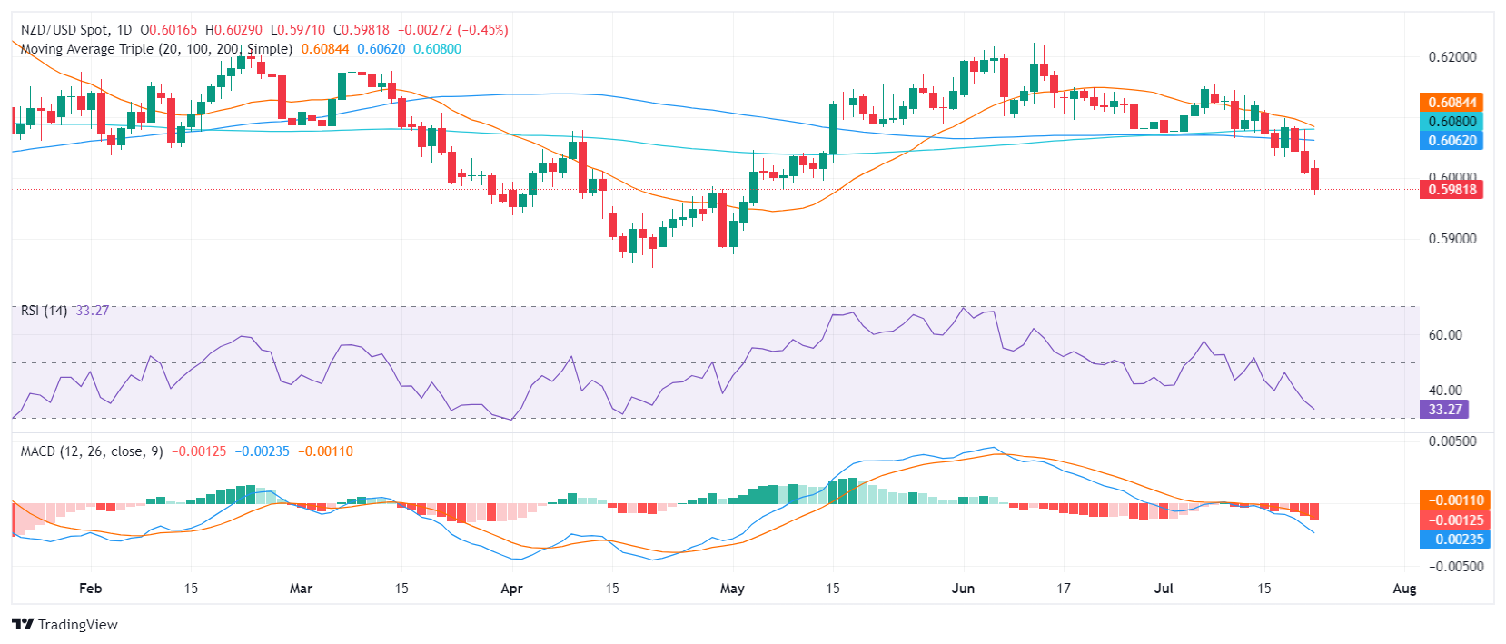 周一盘中,纽元兑美元继续下行,下跌 0.50%,触及 0.5980。多头无力守住 0.6000 水平,最终跌至 5 月初以来的低点,从而确认纽元/美元看跌倾向。
