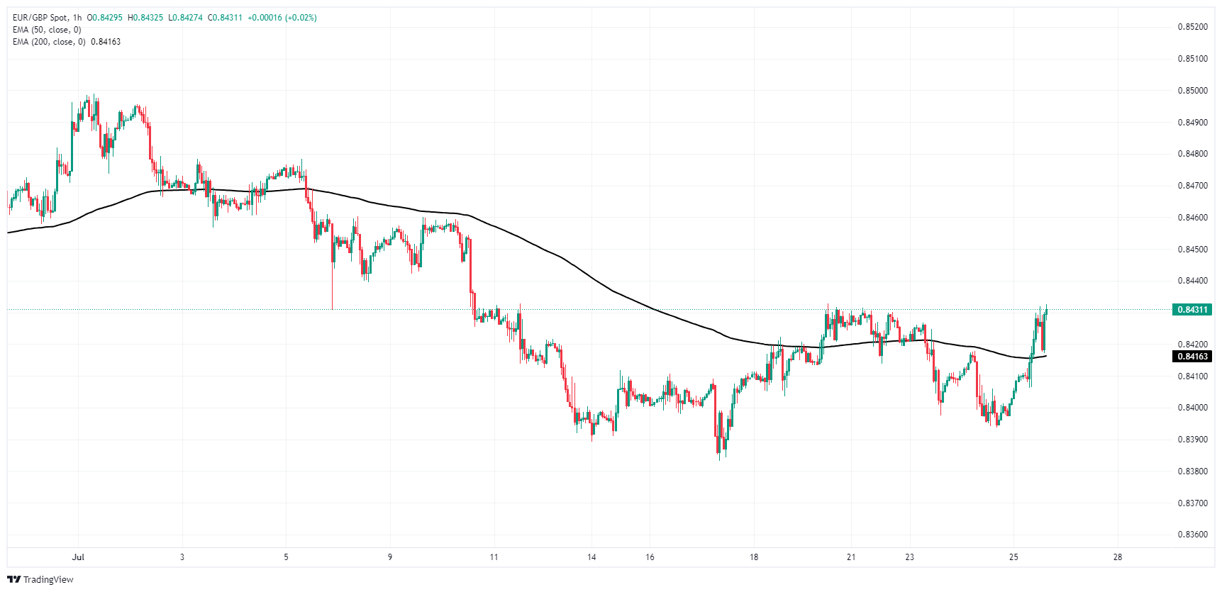 随著市场对英国央行(BOE)下周降息的押注增强,欧元/英镑重回0.8430附近的近期高点。目前,货币市场认為英国央行在一周后的 8 月 1 日举行最新一次利率决议时至少降息25个基点的几率略高于 50%。